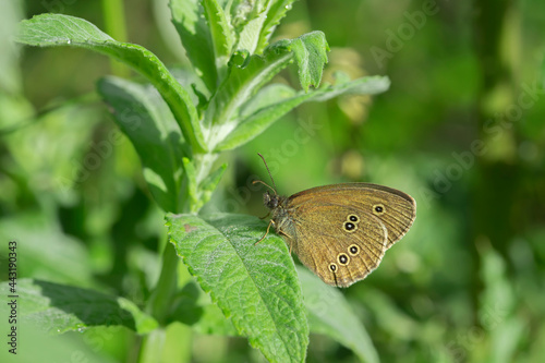Obraz premium Ringlet butterfly (Aphantopus hyperantus) hides between mint leafs.