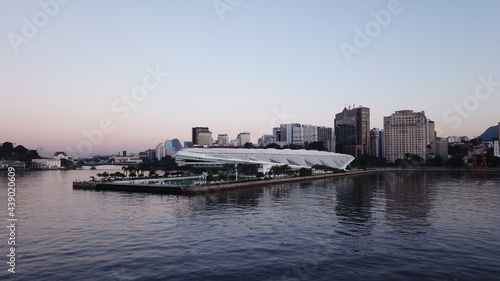 Naklejka premium Rio de Janeiro, rio, Brazil, brasil, museum, sunset, city center, downtown, aerial view, drone, exposition, museu do amanhã, guanabara, south america, travel, culture, museum, square, tomorrow, art, j