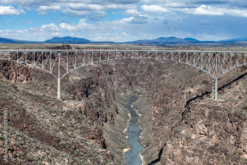 Naklejka premium Rio Grande Gorge Bridge near Santa Fe, New Mexico, this steel arch bridge spans a deep canyon carved by the Rio Grande River, showcasing a stunning example of engineering amidst a rugged, high desert