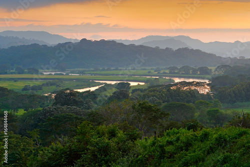 © ondrejprosicky, Fototapeta premium Rio Tarcoles, Carara National Park, Costa Rica. Sunset in beautiful tropic forest landscape. Meander of river Tarcoles. Hills with orange evening sky. Holiday in Costarica. Travel in Central America.