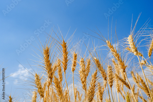 © tienuskin, Fototapeta premium Ripe Barley wheat field against blue sky background.