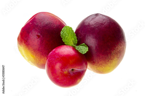 Fototapeta premium Ripe bright peaches, plum and mint