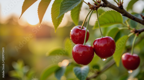 © Tasha, Obraz premium Ripe cherries glistening in morning light on cherry tree branch, freshness