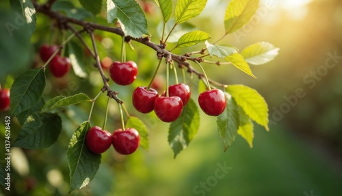 © Tatiana, Obraz premium Ripe cherries growing on a branch in a sunny garden