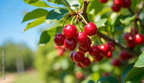 © 陈佳乐, Obraz premium Ripe cherries hanging from a tree branch under bright sunlight