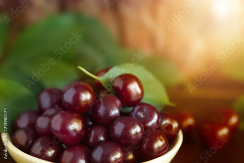 Fototapeta premium Ripe cherry by close-up, on a sunset background, outdoors