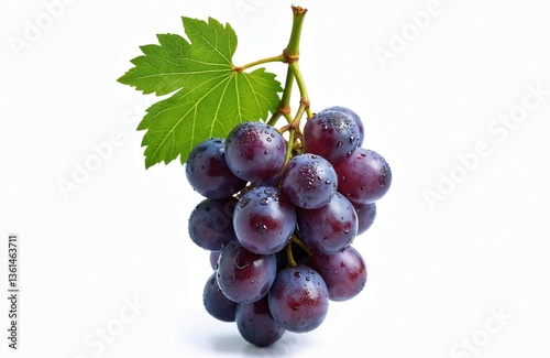 © Viktor, Fototapeta premium Ripe cluster of purple grapes isolated white. Juicy, fresh fruit with green leaf. Antioxidant, vitamin-rich food, perfect for dessert, snack. Healthy organic produce. Perfect for wine production,