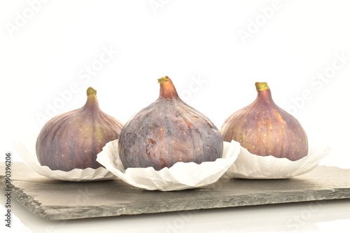 Obraz premium Ripe dark blue organic figs, close-up, on a white background.