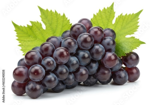 © UniqueStore, Fototapeta premium Ripe dark purple grapes with green leaves on white fruit food