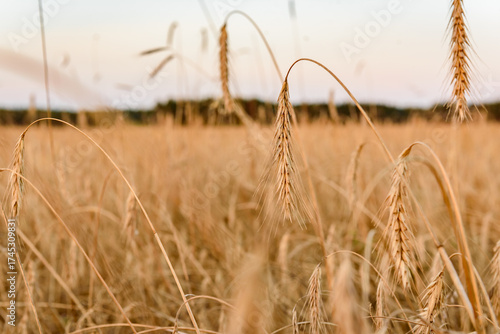 © Natallia, Obraz premium Ripe golden barley ears on the field. Barley farming before harvesting in sunset light.