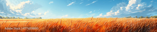 © Oleksandr Pokusai, Naklejka premium ripe golden wheat field stretching to the horizon beneath a bright blue sky with fluffy clouds. Generative ai raster illustration. Wide banner image