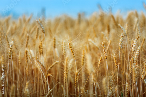 Fototapeta premium ripe golden wheat or barley in nature background at sunset