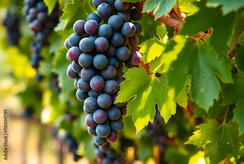© jaggannathe, Fototapeta premium Ripe grapes hung on vineyards of grape trees. In the morning vineyard