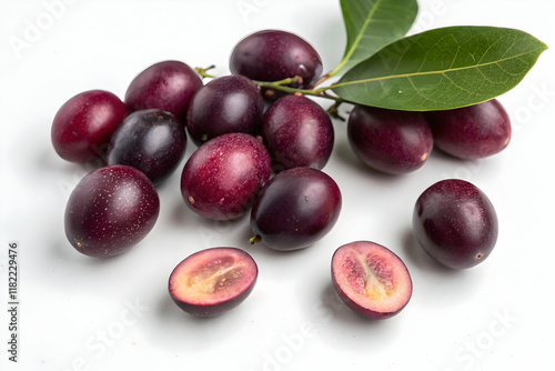 © getti, Obraz premium Ripe Java Plum (Jamun) with Leaves and Cross-Section on White Background