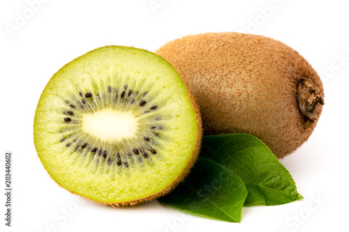 Obraz premium Ripe kiwi and half with leaves on a white. isolated