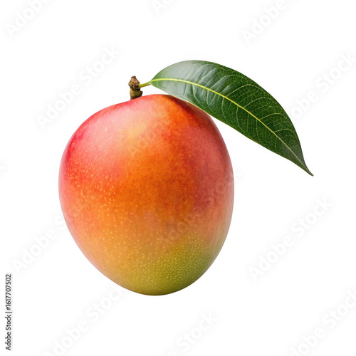 Fototapeta premium Ripe mango with a green leaf isolated on transparent background