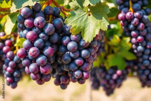 © Dejana, Fototapeta premium Ripe purple grapes hanging on vine in vineyard sunlight