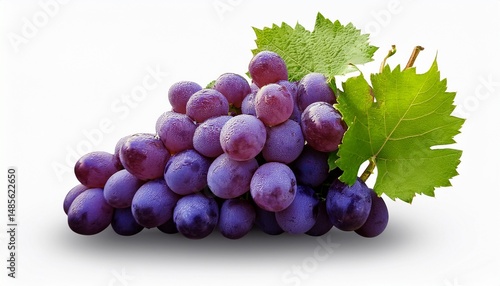 © Alanurmalaa, Fototapeta premium Ripe Purple Grapes with Green Leaves on White Background