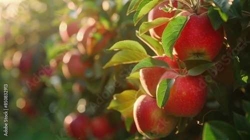 © sadewotito, Obraz premium Ripe Red Apples on a Branch in an Orchard