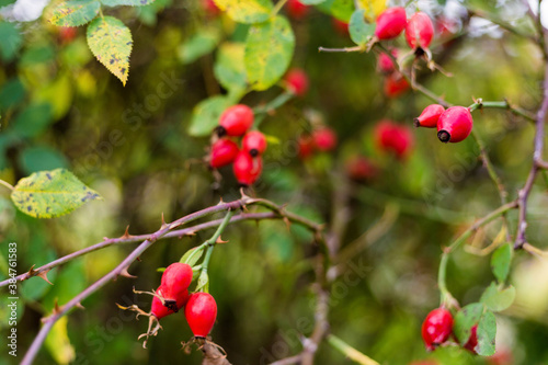 © галина шарапова, Obraz premium Ripe red autumn briar berries on a rose bush branch.