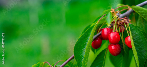 © Iryna, Obraz premium Ripe red cherries on a branch with green leaves