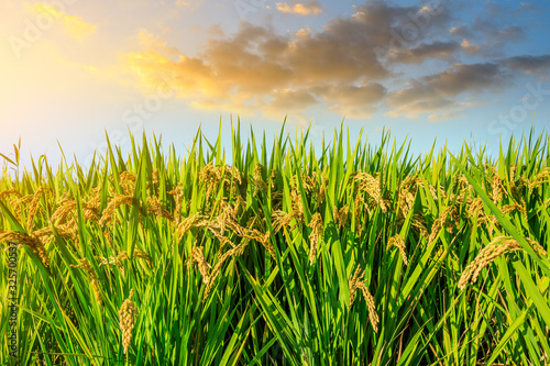 © zhao dongfang, Obraz premium Ripe rice in farmland at dusk in autumn
