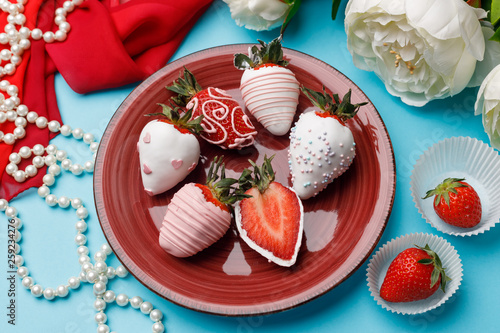© ovbelov1972, Fototapeta premium Ripe strawberries in white chocolate glaze lay on a plate close to white flowers and pearl beads on a turquoise background