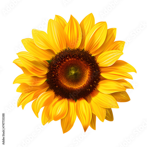 Fototapeta premium Ripe sunflower with yellow petals and dark middle, isolated on white transparent background.