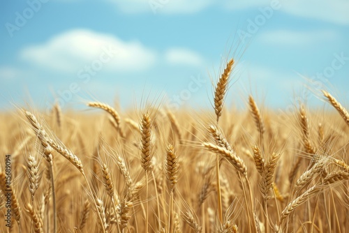 Fototapeta premium Ripe wheat ears against a clear blue sky, symbolizing abundant harvest