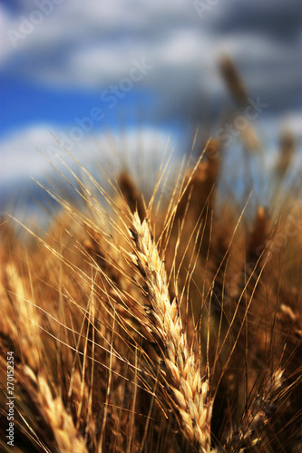 © Vladimir, Obraz premium Ripe wheat ears closeup. Field with splendid wheat