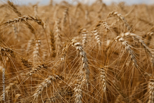 © New Africa, Fototapeta premium Ripe wheat spikes in agricultural field, closeup