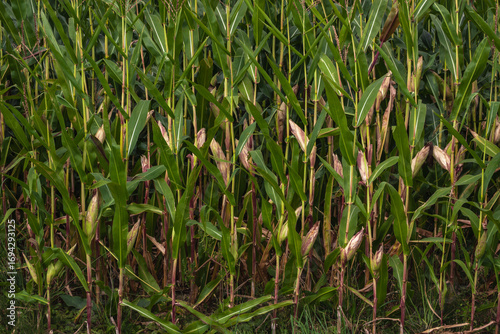Fototapeta premium Ripening corn cobs on a plantation before harvest, agricultural background in...