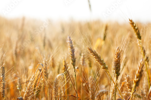 Fototapeta premium Ripening spikelets of wheat field in the bright sunlight