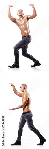 Fototapeta premium Ripped man pushing away virtual obstacle
