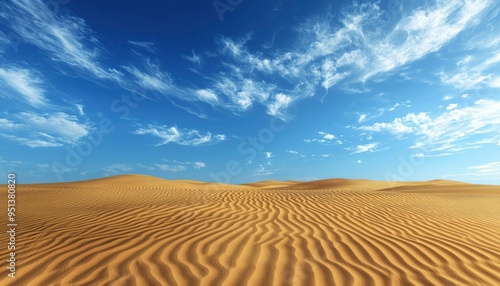 Naklejka premium Rippled Sand Dunes Beneath a Blue Sky With Wispy Clouds
