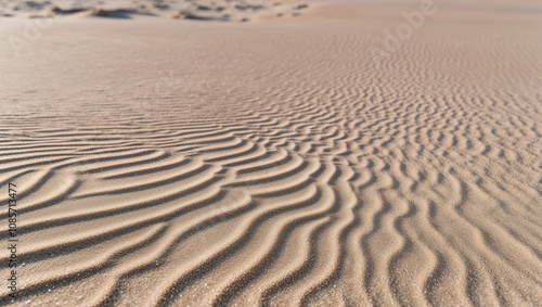 © janzwolinski, Obraz premium Rippled sand dunes create mesmerizing patterns under golden light