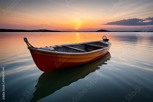 © abidali, Fototapeta premium Rippling color of vibrant sunset hues swirling on the water’s surface, with a small boat