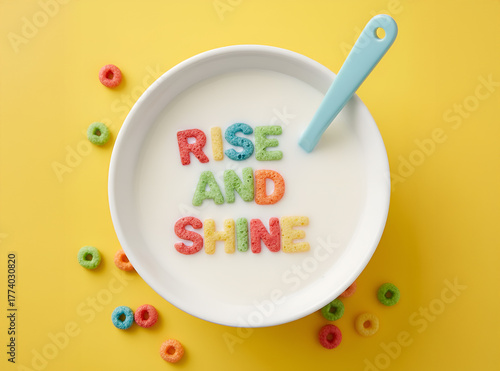 Naklejka premium “Rise and Shine” Cereal Letters in Milk Bowl on Yellow Background