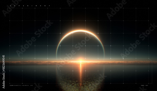 Obraz premium Rising arc of radiant eclipse above calm horizon. Concept of immersive UI...
