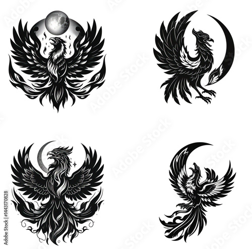 © Illustra, Obraz premium Rising Phoenix Silhouette with Crescent Moon – Symbolic Minimalist Tattoo or Logo Vector