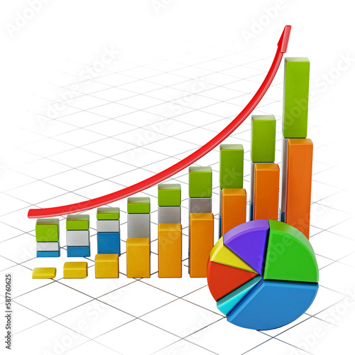 © Destina, Fototapeta premium Rising sale bars and pie chart showing financial data on transparent background. 3D illustration