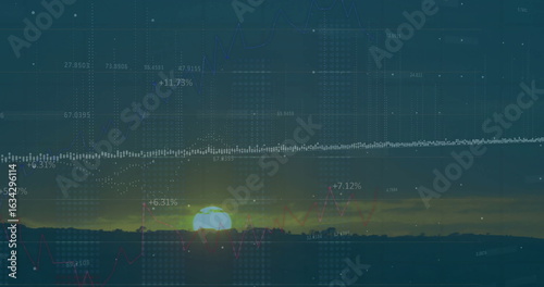 © vectorfusionart, Obraz premium Rising sun disk glowing above mountain ridge silhouette at dusk, with financial data overlays