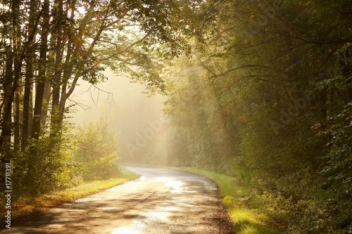 © Aniszewski, Naklejka premium Rising sun falls into the misty forest in the colors of autumn