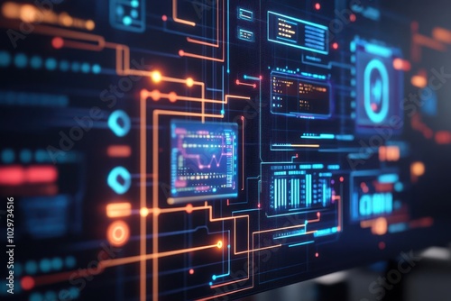 Fototapeta premium Risk control system, virtual holographic panels, sleek office backdrop, neon circuit data flow