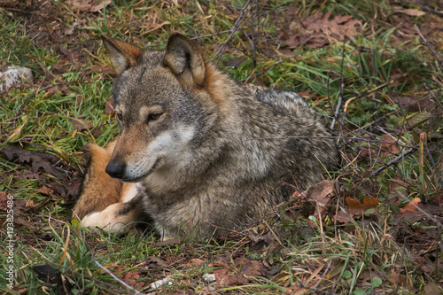 Naklejka premium Ritratto di un lupo selvatico seduto nel prato