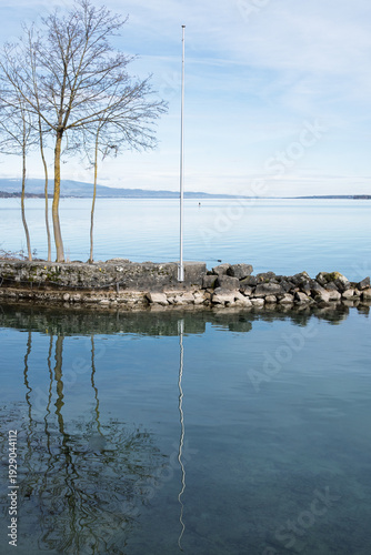 © Pyc Assaut, Fototapeta premium Rive paisible du lac Léman à Genève avec arbres dépouillés et reflets dans l'eau calme