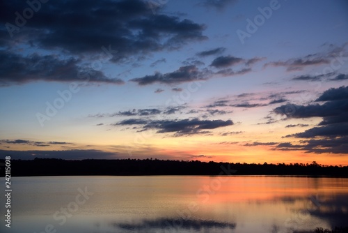 © Khathawuth, Naklejka premium river and mountain landscape on sunset orange background