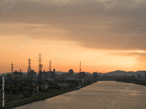 Fototapeta premium 川と夕焼け。River and sunset.