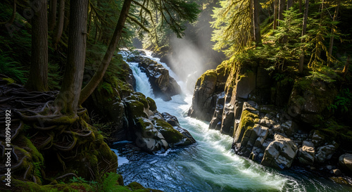 © Hamza, Fototapeta premium River and Waterfalls Flowing Through Lush Green Forest with Moss Covered Rocks on Bright Sunny Day in Pacific Northwest Forest Landscape Scenery at Sol Duc Falls