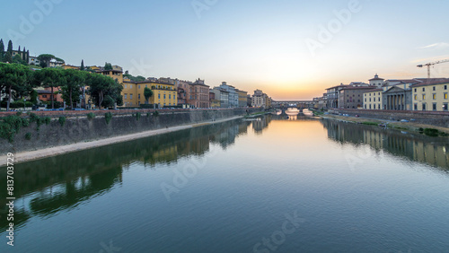 Obraz premium River Arno and famous bridge Ponte Vecchio day to night timelapse after...
